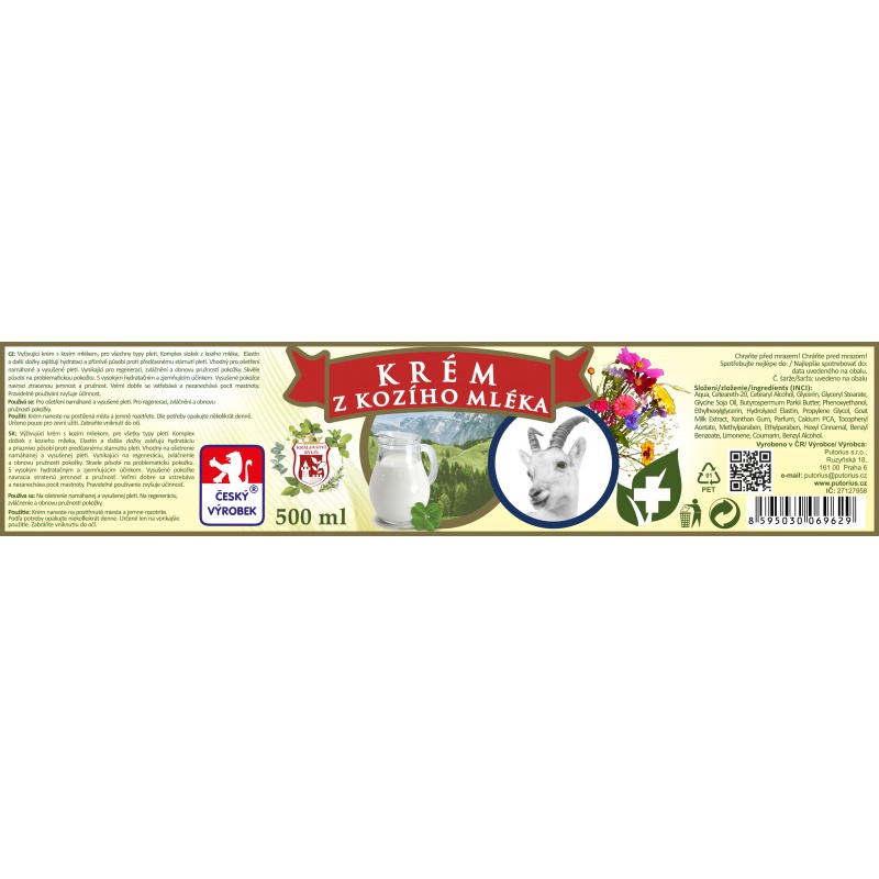Vyživující krém s kozím mlékem, pro všechny typy pleti. Komplex složek z kozího mléka, zajištují hydrataci a příznivě působí proti předčasnému stárnutí pleti. Vhodný pro ošetření namáhavé a vysušené pleti. Vynikající pro regeneraci, zvláčnění a obnovu pružnosti pokožky. Skvěle působí na problematickou pokožku. S vysokým hydratačním a zjemnujícím účinkem. Vysušené pokožce navrací ztracenou jemnost a pružnost. Velmi dobře se vstřebává a nezanechává pocit mastnoty. Pravidelné používání zvyšuje účinnost. Používá se: Pro ošetření namáhavé a vysušené pleti. Pro regeneraci, zvláčnění a obnovu pružnosti pokožky. Krém naneste na postižená místa a jemně rozetřete. Dle potřeby opakujte několikrát denně. Určeno pouze pro zevní užití. Zabraňte vniknutí do očí. Chraňte před mrazem. Spotřebujte nejlépe do: uvedeno na obalu. Složení: Aqua, Ceteareth-20, Cetearyl Alcohol, Glycerin, Glyceryl Stearate, Glycine Soja Oil, Bultyrospermum Parkii butter. Phenoxyethanol, Ethylhexylglycerin, Hydrolyzed Elastin, Propylen Glycol, Goat milk extract, Xanthan gum, Parfum, Calcium PCA, Tocopheryl Acetate, Methylparaben, Ethylparaben, Hexyl Cinnamal, Benzyl Benzoate, Limonene, Coumarin, Benzyl Alcohol.