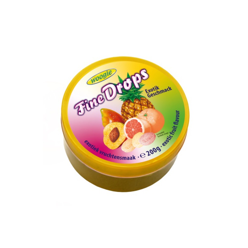 Exotické bonbóny s sebou. Woogie Fine Drops Exotic, uložené v uzavíratelné kovové plechovce, přinášejí do každé přestávky čistou sváteční náladu díky intenzivní vůni tropického ovoce, jako je ananas, mango a grapefruit. Nádech dovolené v každém bonbónu!