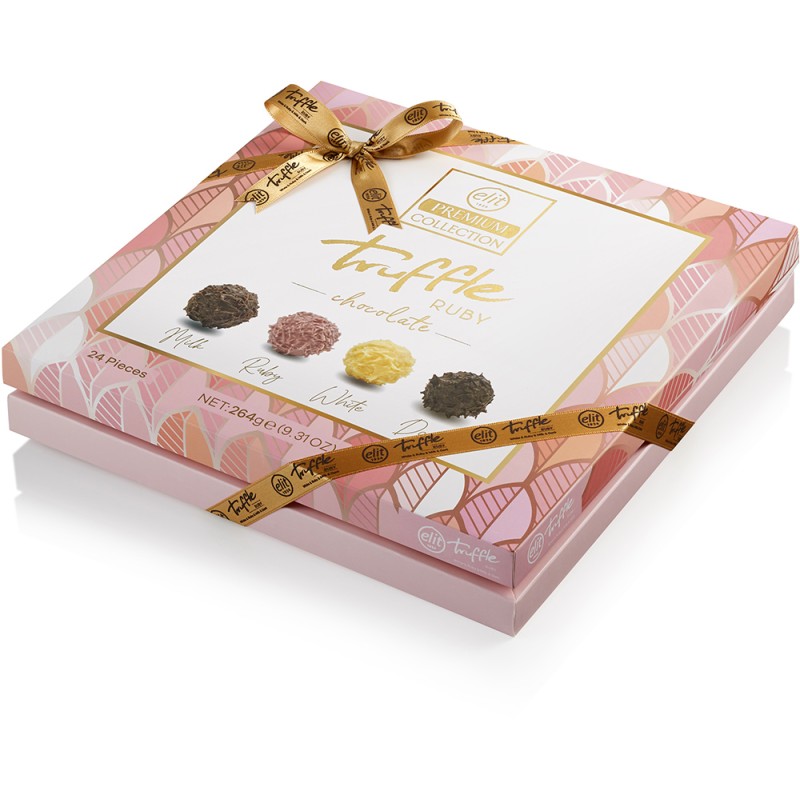 Prémiová kolekce lanýžů Elit s rubínem nabízí luxusní čokoládové lanýže s bohatými a jedinečnými chutěmi, které jsou dokonalým spojením kvalitní čokolády a vybraných ingrediencí. Tento výběr zahrnuje bílé, mléčné a hořké čokoládové lanýže s příchutí mastichy, malin a kakaa.