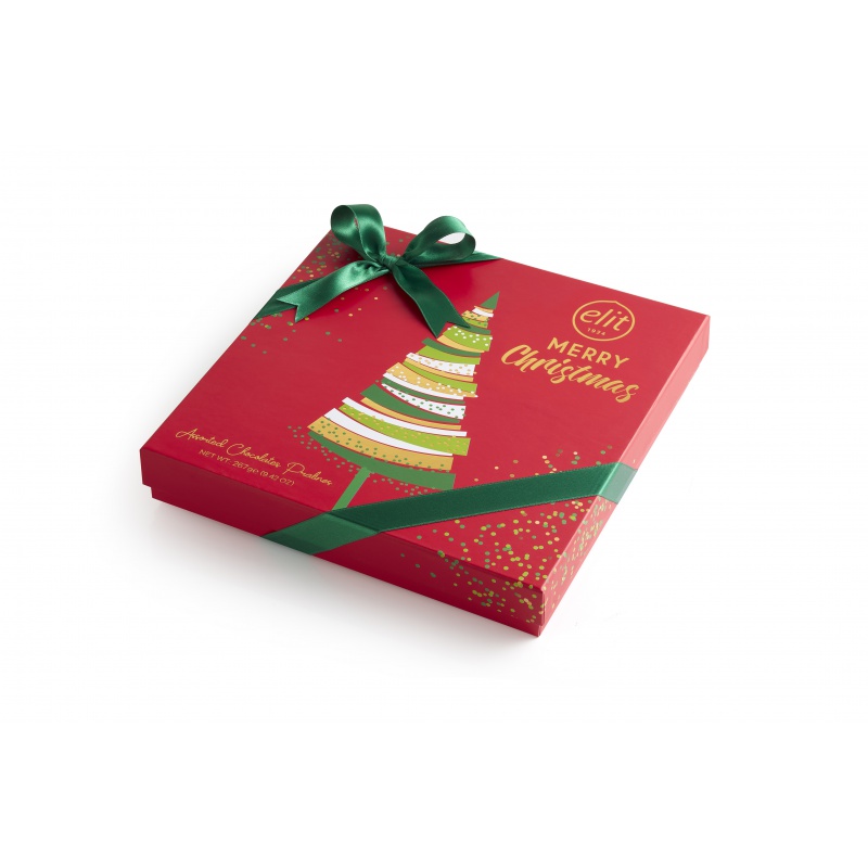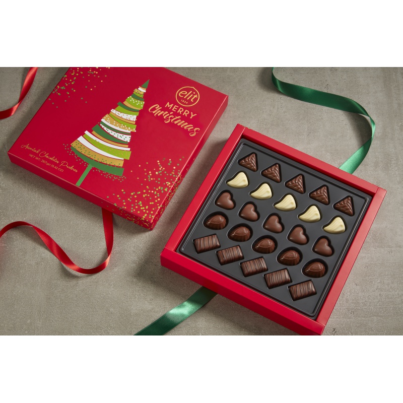 Tato vánoční bonboniéra je opravdovou lahůdkou pro všechny milovníky čokolády. Obsahuje širokou škálu lahodných pralinek, které spojují nejlepší chutě mléčné a hořké čokolády s různými krémy a oříšky. Každá pralinka je pečlivě vyrobena z kvalitních ingrediencí a přináší nejen vynikající chuťový zážitek, ale také vizuální pohodu díky svému atraktivnímu designu ve vánočním stylu.