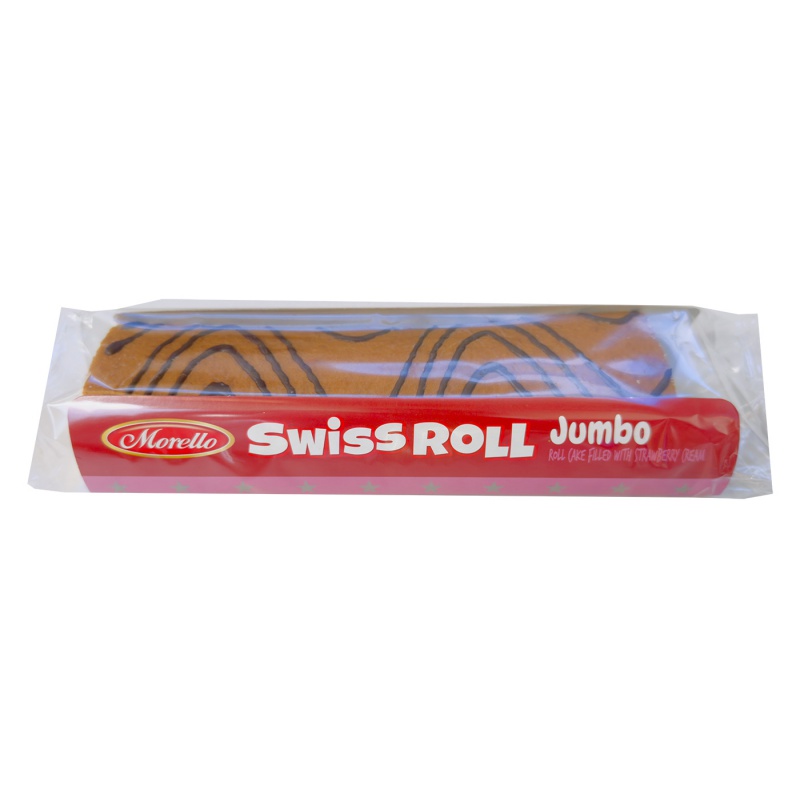 Roláda s krémem s jahodovou příchutí a jahodovým džemem s kakaovým zdobením