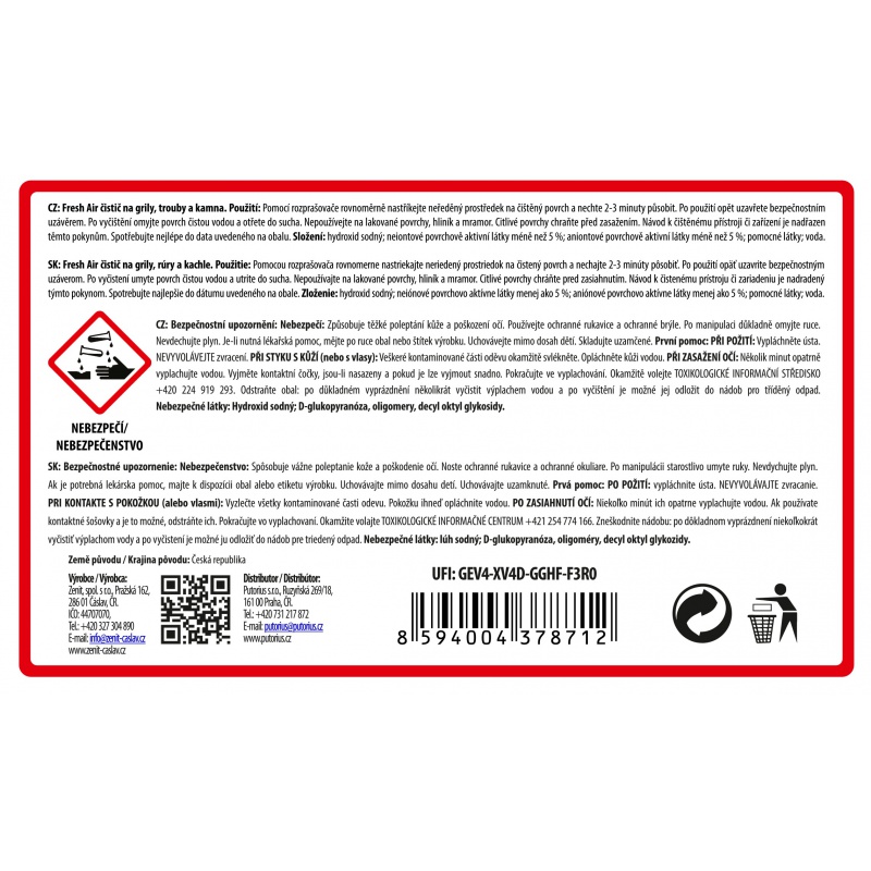 svlékněte. Opláchněte kůži vodou. PŘI ZASAŽENÍ OČÍ: Několik minut opatrně vyplachujte vodou. Vyjměte kontaktní čočky, jsou-li nasazeny a pokud je lze vyjmout snadno. Pokračujte ve vyplachování. Okamžitě volejte TOXIKOLOGICKÉ INFORMAČNÍ STŘEDISKO +420 224 919 293. Odstraňte obal: po důkladném vyprázdnění několikrát vyčistit výplachem vodou a po vyčištění je možné jej odložit do nádob pro tříděný odpad. Nebezpečné látky: Hydroxid sodný; D-glukopyranóza, oligomery, decyl oktyl glykosidy